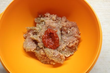 2. После того, как фарш с луком немного обжарились, солим его и добавляем приправу "прованские травы". Перемешиваем.