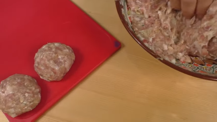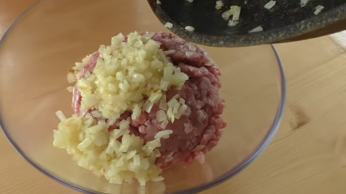 Пока соус готовится, делаем фрикадельки. Фарш кладём в большую миску. Я обычно беру 400 г говяжьего фарша и 100 г свиного фарша. Можно в магазине купить так называемый "домашний" фарш, его тоже обычно делают из говядины и свинины.