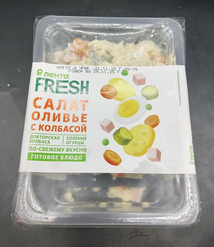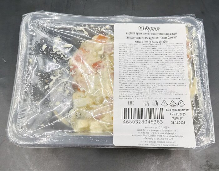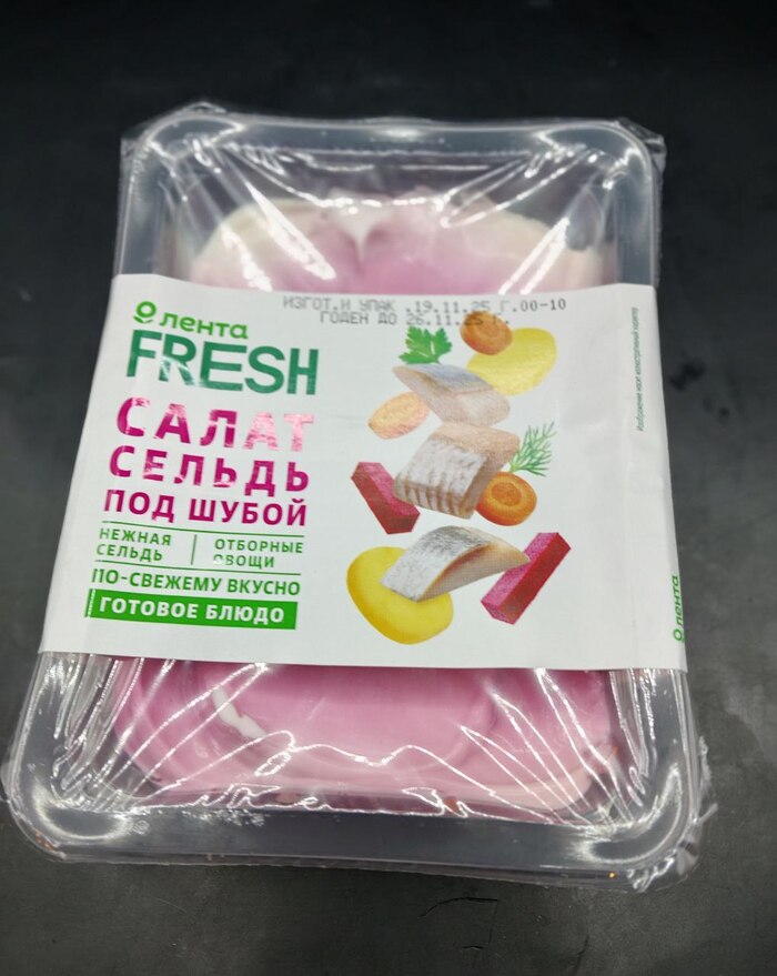 Сначала меня поразил слой майонеза под которым не видно салата, но потом всё встало на свои места. Этот майонезный "наст" пытался скрыть недочищенные овощи и горько-кислую сельдь. Дегустировала я его 23.11, не думаю что вкус связан со сроком годности, скорее всего туда сложили какие-то продуктовые остатки и выставили на продажу. Салат ушёл в мусорку вслед за магнитовским.