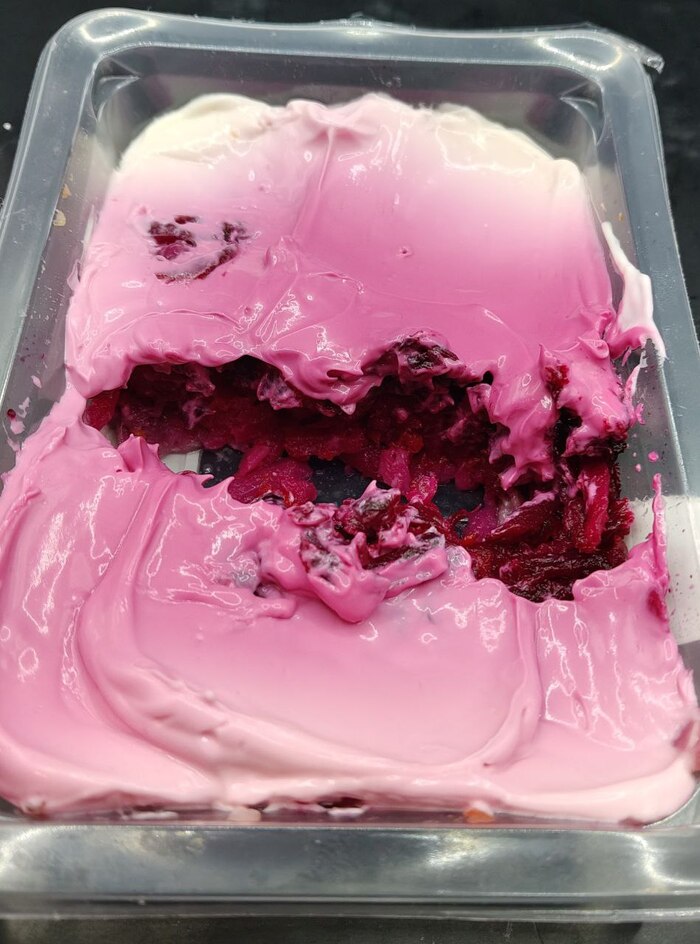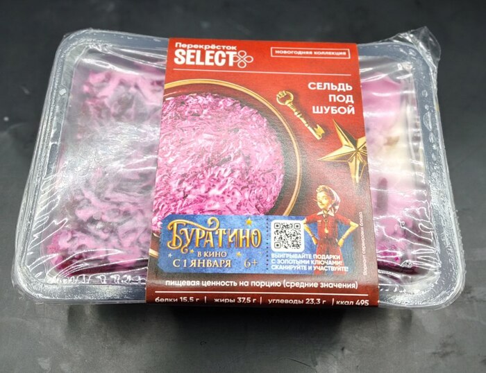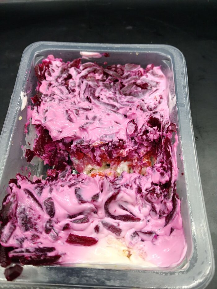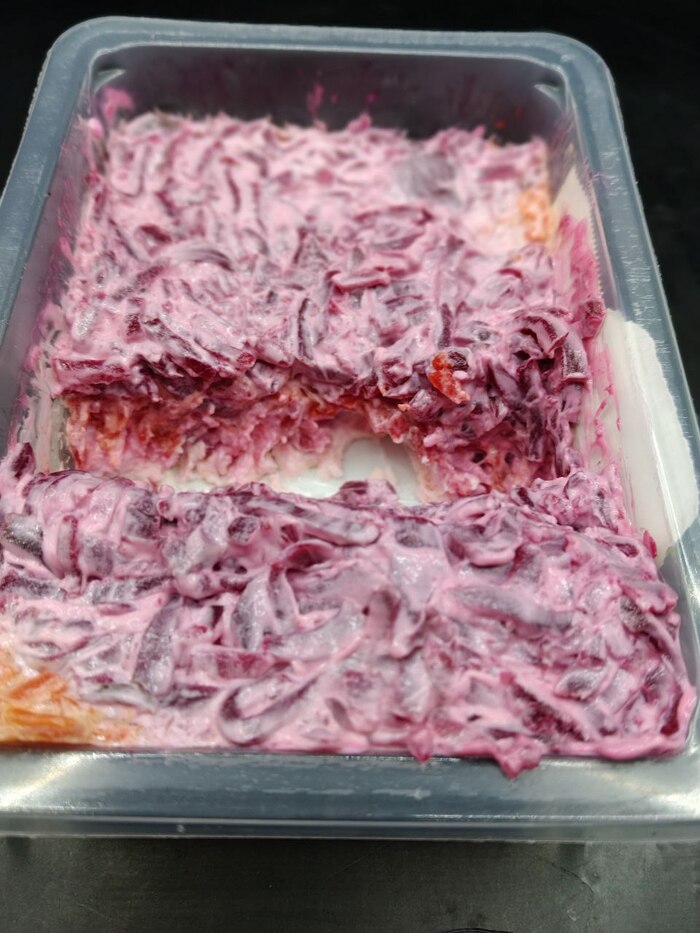 Здесь тоже чувствуется не вся комплектация салата, но непривычный калибр свёклы придаёт салату изюминку, сельдь нарезана небольшими кусочками, а сам салат плотно занимает весь контейнер, а не катается по нему из стороны в сторону как в "Магните". Это не классическая сельдь под шубой, но вполне хороший салат.