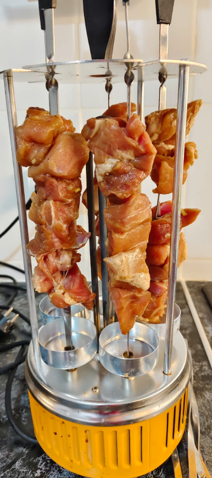 Включаю шашлычницу и жарю. Принцип работы простой. Вертит шампуры вокруг тэна.