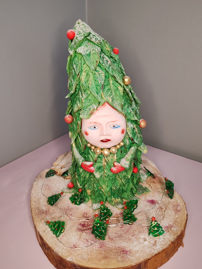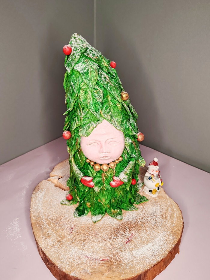 Торт печётся как обычный, но собирается вверх, затем шоколадный ганаш скрепляет всю эту конструкцию и украшается сверху - у меня мастика, а можно и пластичным шоколадом, с ним вкуснее, но и дороже в разы.. Елочка получилась необычная, весёлая и нарядная - украшение стола, я так думаю. (Да вместо иголок - листья, но так и задумано)