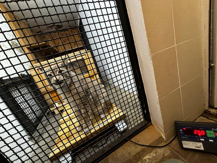 Взвешивание рысей происходит следующим образом: в клетке устанавливается специальная платформа, сверху кладётся деревянный щит, который служит удобным местом для посадки. Затем весы обнуляются, и после этого дверь клетки открывается, впуская внутрь роскошного хищника. С грацией истинной охотницы рысь плавно опускается на щит и терпеливо ожидает, пока весы зафиксируют её вес.