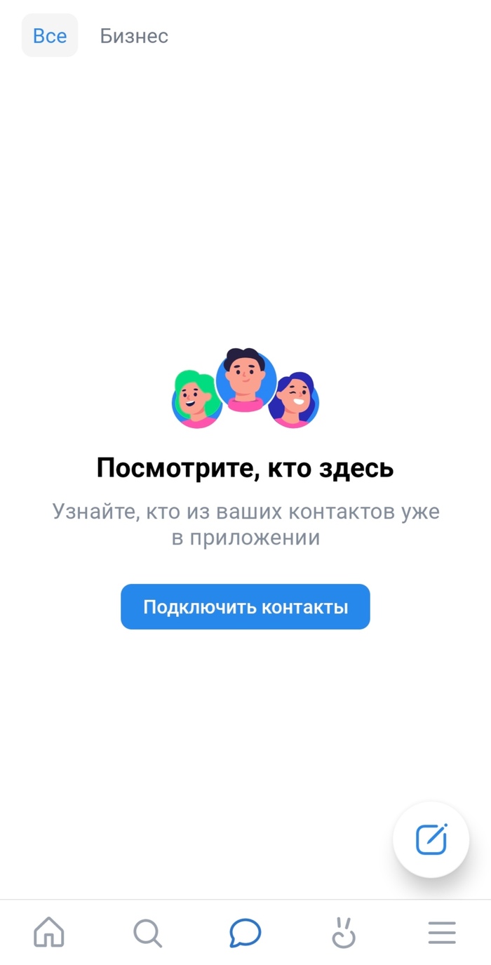 Сижу я вечером, никого не трогаю, листаю ленту и решила перейти в чаты VK. А вот тут - сюрприз! Вместо списка чатов меня встречает надпись "Посмотрите, кто здесь" и кнопка "подключить контакты". WTF?