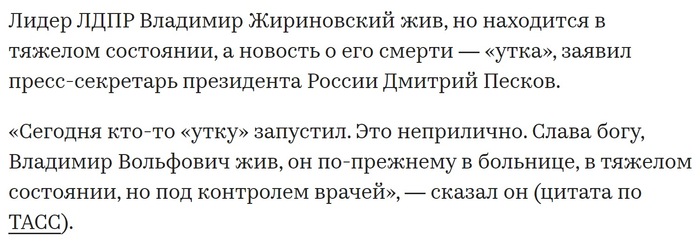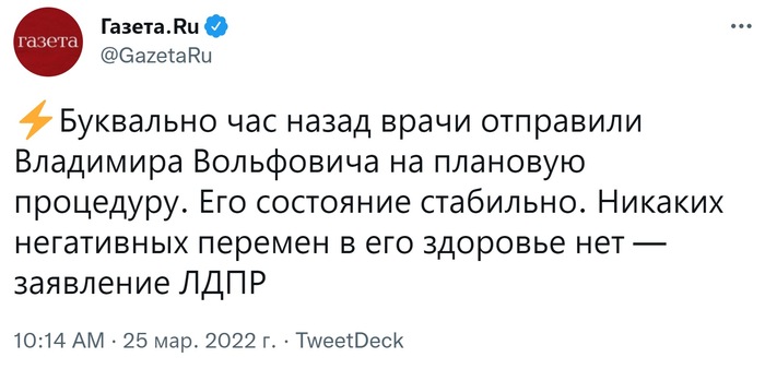UPD: ЛДПР: Мы категорически опровергаем ложь о смерти Владимира Жириновского. Буквально час назад врачи отправила Владимира Вольфовича на плановую процедуру. Его состояние СТАБИЛЬНО. Никаких негативных перемен в его здоровье нет.
