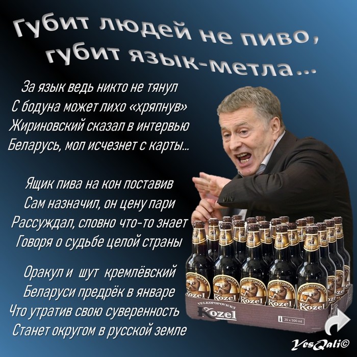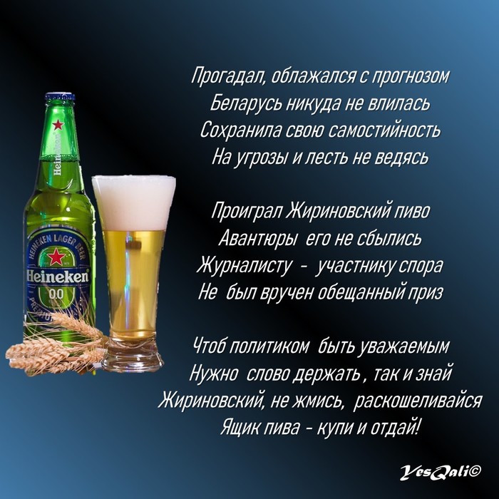 19 августа 2020 года, вице-спикер Госдумы РФ и лидер ЛДПР Владимир Жириновский в интервью с журналистом российского интернет-издания "Эхо Москвы", пространно рассуждая о судьбе Беларуси поспорил на ящик пива, что с 1 января 2021 года Беларусь, утратив свою суверенность окажется одним из автономных субъектов России на правах федерального округа. Выражаясь языком крупье - ставка Вольфыча не сыграла. Но во внешней политике символизм играет большую роль и судьбу целой страны мерить в литрах?! Это какое же нужно иметь завышенное ЧСВ? Мои же попытки разузнать о судьбе пари оказались безуспешными. Но, походу Жириновскому уже не впервой кидать людей...