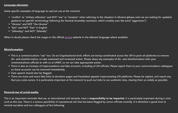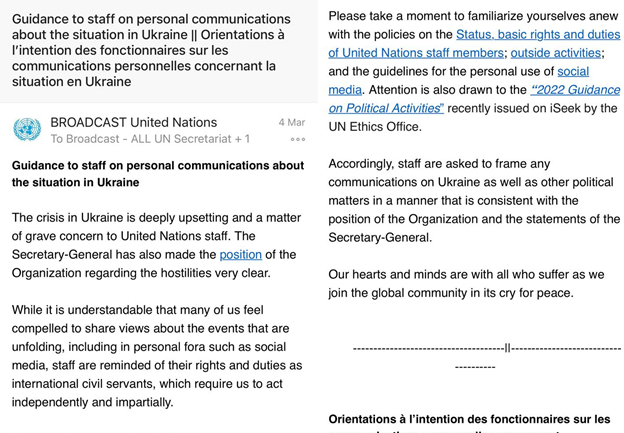 8 марта СМИ всего мира сообщили о том, что сотрудникам ООН запретили использовать слова «война» и «вторжение» применительно к боевым действиям в Украине, а также размещать флаги Украины в личных и рабочих аккаунтах в соцсетях во избежание «репутационных рисков».