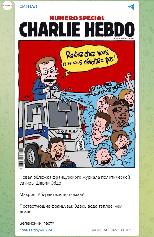 На рубеже августа и сентября в интернете стала популярной новая обложка, также якобы украсившая специальный номер сатирического издания. На этот раз главным героем стал президент Франции Эмманюэль Макрон, который из брандспойта поливает протестующих. Перед полицейским автомобилем, на котором изображён французский лидер, — вновь президент Украины в виде собаки. На этот раз он нюхает некую коричневую субстанцию из миски в цветах флага ЕС. Карикатуру активно постили в Telegram, в том числе крупные русскоязычные каналы: «Легитимный» (824 000 подписчиков), «Пуля» (792 000) и «Сигнал» (715 000). Упоминания обложки можно также встретить в Twitter и других соцсетях.