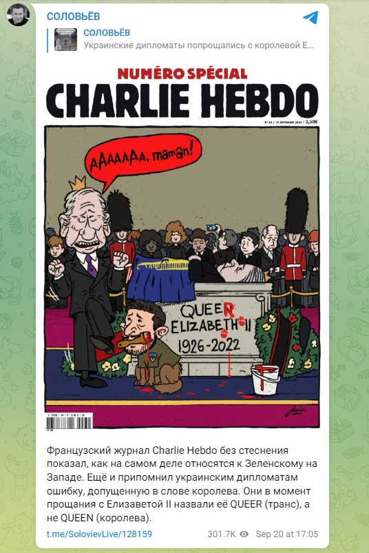 Наконец, в середине сентября вновь появилась карикатура, посвящённая событиям в Великобритании. В центре изображения — умершая 8 сентября королева Елизавета II, слева — её сын и нынешний монарх Карл III. При этом в надписи на постаменте в слове queen («королева») исправлена последняя буква — так получилось queer (либо «представитель ЛГБТ+», либо «странный, необычный»). Кисточку с краской, использованной при исправлении, вновь держит Зеленский-пёс, одетый в зелёную майку с жёлто-синим шевроном на лапе. Эта карикатура также разошлась по Telegram — ею делились, например, телеведущий Владимир Соловьёв (1,4 млн подписчиков), каналы «Пул N3» (274 000) и «Open Ukraine 37# | Открытая Украина 37#» (199 000), пользователи Facebook*, Twitter, Pikabu, «ЯПлакалъ» и даже некоторые СМИ.