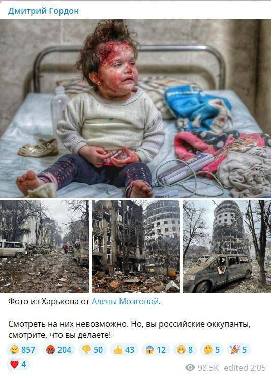 5 марта известный украинский журналист Дмитрий Гордон поделился подборкой фотографий из находящегося под обстрелом Харькова. Особенное внимание читателей привлёк кадр с окровавленным ребёнком, сидящим на больничной койке.