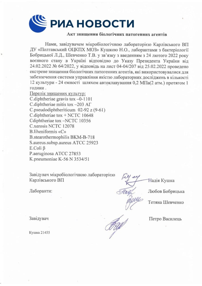 К сообщению прилагались фотографии указания минздрава Украины об уничтожении «особо опасных патогенов возбудителей чумы, сибирской язвы, туляремии, холеры и других смертельных болезней», а также акты уничтожения в полтавской и харьковской биолабораториях:
