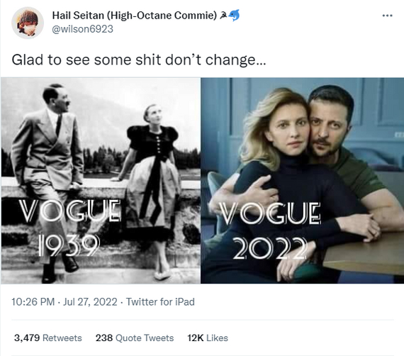 А вот уже 28 июля (по московскому времени) в комментариях действительно появились фотографии, подписанные Vogue 1939 с Гитлером и его гражданской на тот момент женой. Такую же фотографию мы можем увидеть в публикации телеканала «Царьград», которая ссылается на пост в Telegram пользовательницы Юлии Витязевой. Пост этот подписан словами: «Американцев, смотрю, уже не остановить». Что означает эта подпись, Юлия уточнила в комментариях: «Поясняю: сейчас весь американский сегмент тви под завязку забит фотожабами, созданными по мотивам фотосета четы Зеленских для Vogue. Это одна из них. Явно намекающая на определённые параллели».