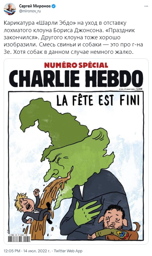 На обложке, ставшей вирусной этим летом, изображён гоблин с головой и шляпой, вместе образующими карту Великобритании. Этот персонаж срыгивает Бориса Джонсона (7 июля он как раз заявил о своей отставке с поста премьер-министра), в правом нижнем углу изображена собака с лицом Зеленского — во рту у пса человеческая рука с нашивкой полка «Азов» (признан властями РФ террористической организацией) на предплечье. «Смесь свиньи и собаки — это про г-на Зе. Хотя собак в данном случае немного жалко» — с таким комментарием эту обложку опубликовал в Twitter глава фракции «Справедливая Россия — За правду!» в Госдуме, экс-глава Совета Федерации Сергей Миронов. Ею делились и простые пользователи этой соцсети, а также Facebook*, LiveJournal и Pikabu. Популярной обложка стала и в Telegram — её публиковали в том числе каналы «Сигнал» (715 000 подписчиков на момент написания этого разбора), «#Монтян!» (526 000), «Осташко! Важное» (338 000) и «Пул N3» (274 000).