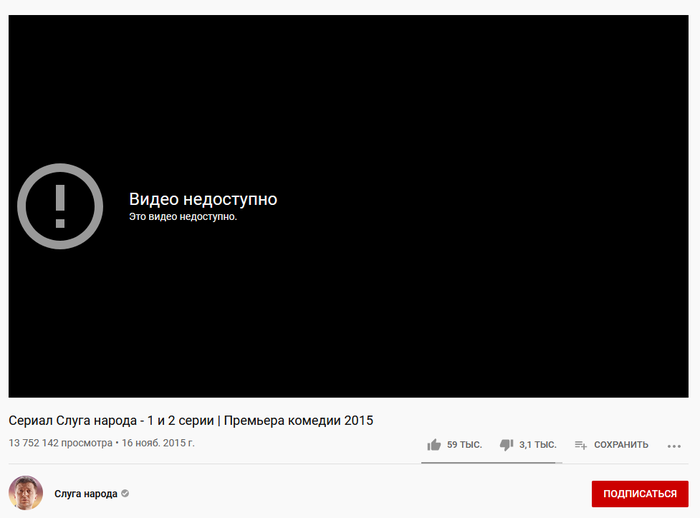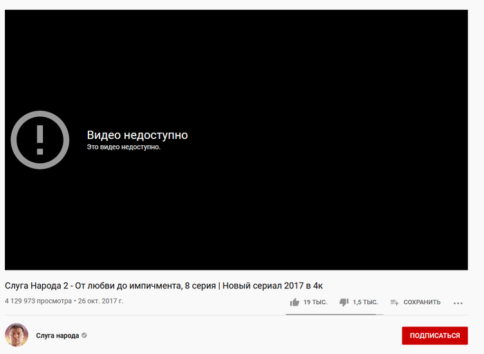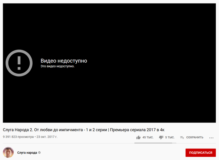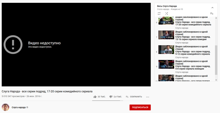 Сегодня днём, 20 декабря, были заблокированы все серии "Слуга Народа" и "Слуга Народа 2", в том числе и сборники серий, такие как "9 - 12 серия" и другие.