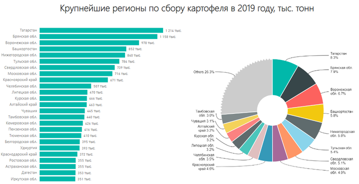 Обратная ситуация — значительный рост сбора картофеля в абсолютном выражении показали: Воронежская, Астраханская и Тульская области, а также Дагестан. Воронежская область в 2019 году вышла на 3 место в России по сбору картофеля и приблизилась к отметке 1 млн тонн в год.