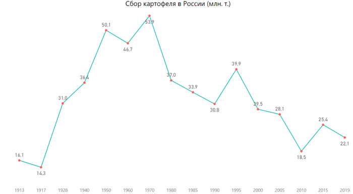 Максимальный сбор картофеля в РСФСР наблюдался в период правления Брежнева в 1970 году — 53,9 млн тонн, а по прошествии 40 лет уже в России, в 2010 г., был минимальный урожай — 18,5 млн тонн.