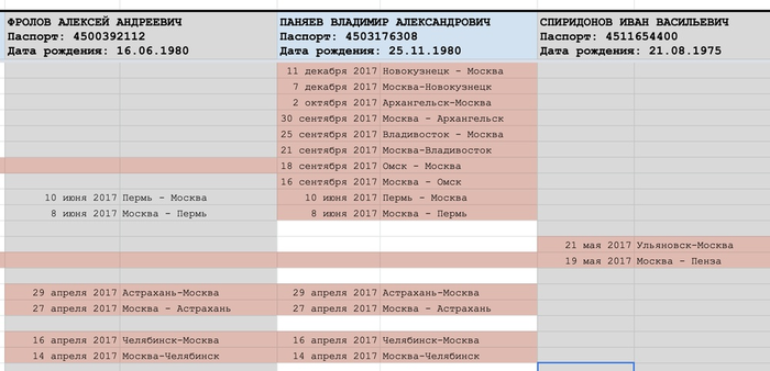 Берем слитую базу авиаперелетов. Берем список всех людей, которых считаем причастными к группе отравителей из ФСБ. 8 фамилий, из которых 6 настоящие и 2 выдуманные личности с документами прикрытия.