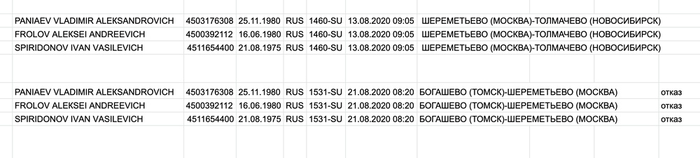 Среди пассажиров нескольких рейсов Москва-Новосибирск 13 и 14 августа мы ищем тех, кто 20-го или 21-го собирался вернуться в Москву, но уже из Томска. Таких пассажиров несколько. Я, например. Еще 6 сотрудников ФБК, которые были со мной в этой поездке. И еще трое наших попутчиков, которых я, к своему удивлению, совсем не узнаю.