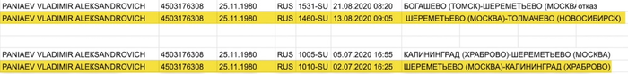 В попытке узнать про этих загадочных людей хоть что-то, мы запрашиваем данные об их перемещениях — это тоже услуга, очень доступная в интернете, — не летали ли они недавно еще куда-то, и выясняем: Паняев в 2020-м покидал Москву только дважды — один раз отправился с нами в Сибирь, а перед этим, 2 июля — в Калининград.