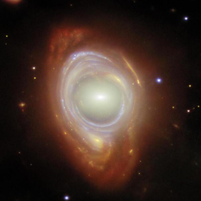 На первый взгляд это кажется одной странно выглядящей галактикой, но на самом деле мы видим два объекта, разделенных огромным расстоянием в космосе. В центре изображения находится галактика переднего плана, а вдали от нас располагается другая галактика, чье свечение создает эффект кольца вокруг ближайшего объекта.