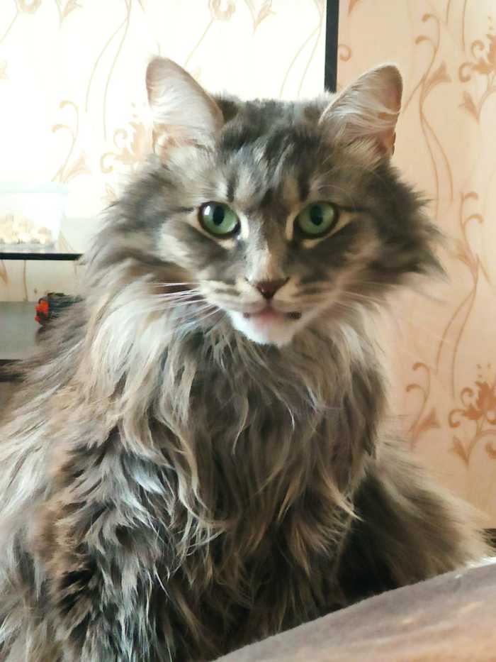 Серый окрас, длинная шерсть, зеленые глаза.