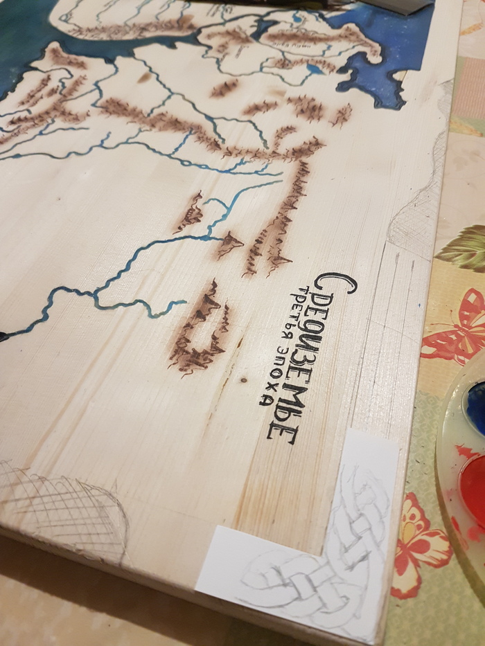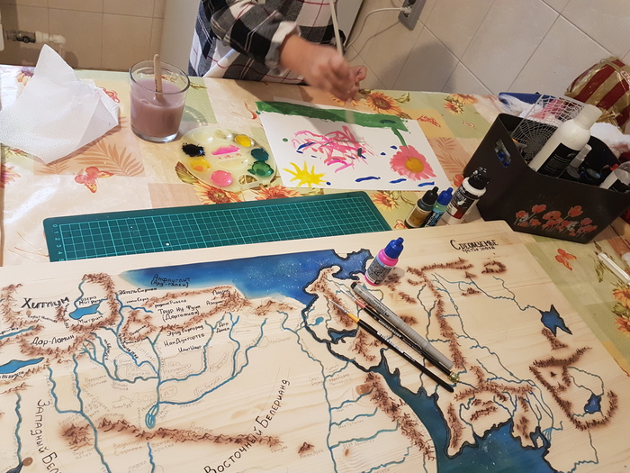Началась часть художественная, хотя больше проблем возникло с русскими названиями месностей на карте. Пару дней ушло на нанесение на карту всех букв. Крупные названия делал тонкой кистью, совсем мелкие маркером 0,1мм.