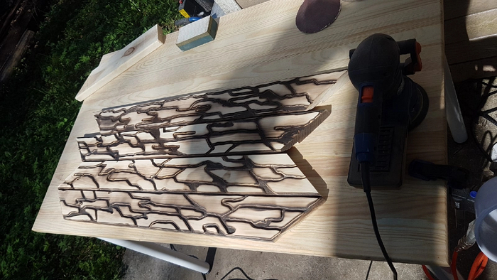Занялся рамой. Для этого были куплены 4 деревяшки, рандомно в них выпилились углубления фрезером. Далее обжог горелкой, для более сглаженных углов, грунт, краска, лак.
