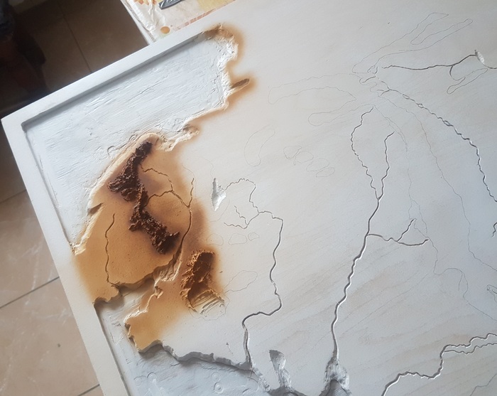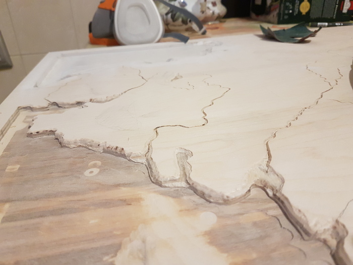 Большие обьемы убирал фрезером, но не всё выходило гладко, так как фрезер держал в руках первый раз. Далее подравнивал края и выпиливал реки машинкой для маникюра (последующем для этого был докуплен дремель).