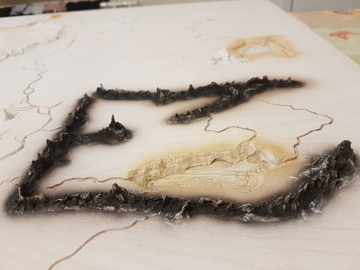 А потом началась более серьезная работа с фрезером, карта 90×90см с обьемными горами, городами и мощной рамой обитой кожей. Если будет интересно, напишу о ней пост и покажу поближе ))