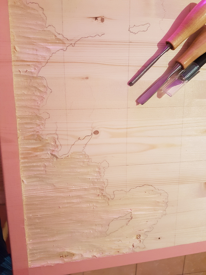 Посмотрев в интернетах как мастера лихо орудуют стамесками, я сходил в ближайший строительный и купил самый дешевый набор стамесок, но... толи лыжи не поехали.. толи стамески были совсем плохими.. Работа шла не так бодро как я себе представлял. Но цель была поставлена, и вооружившись машинкой для маникюра и стамесками, я начал потихоньку долбить заранее расчерченный рельеф поверхности.