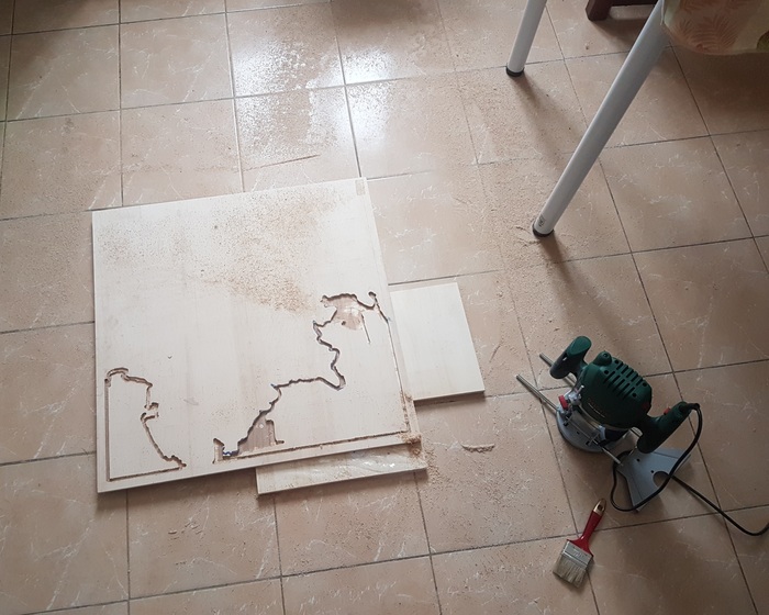 В начале был куплен самый большой кусок фанеры 80×80 см и ручной, погружной фрезер и работа закипела..