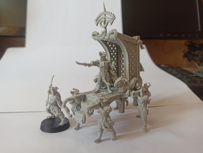 Сама моделька или даже МОДЕЛИЩЕ шло с огромным количеством деталей, ибо по сути здесь две версии Императора - на паланкине и пешим. Если герои варгейма часто имеют две вариации (пешую и конную), то паланкин конечно дело особое, ибо он состоит из нескольких частей. Необходимо было собрать двух Императоров (один из них будет стоять непосредственно на паланкине), второй если вдруг паланкин сломают или вдруг он захочет сойти с него. Непосредственно сам паланкин, состоящий из множества деталей, статуй, знамени, даже трона - его не видно на фото, но там есть место, где правителю можно присесть. И конечно шести чёрных драконов, что тащат на своём горбу это средство передвижения, так мало того, что они его тащат, так они ещё и сражаются! Причём чем меньше их остаётся, тем и меньше атак. Всё логично.