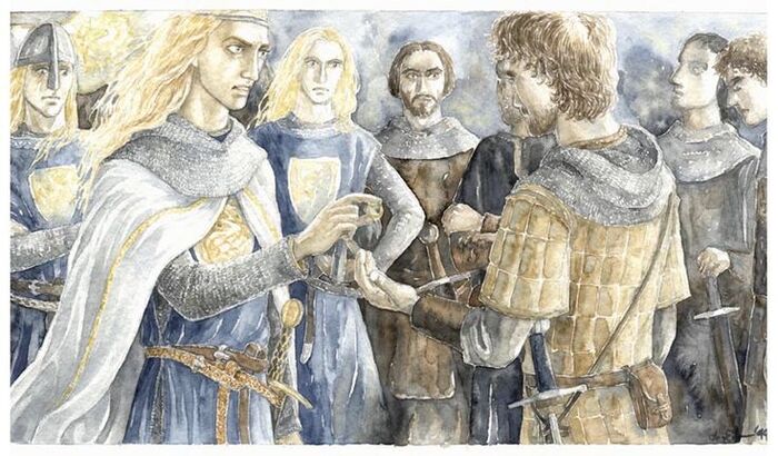 Из текста известно: «Кирдан, с самой первой встречи в Серых Гаванях, почувствовал в нём величайший дух и самую глубокую мудрость; и он приветствовал его с почтением, и отдал ему на хранение Третье Кольцо, Нарья».