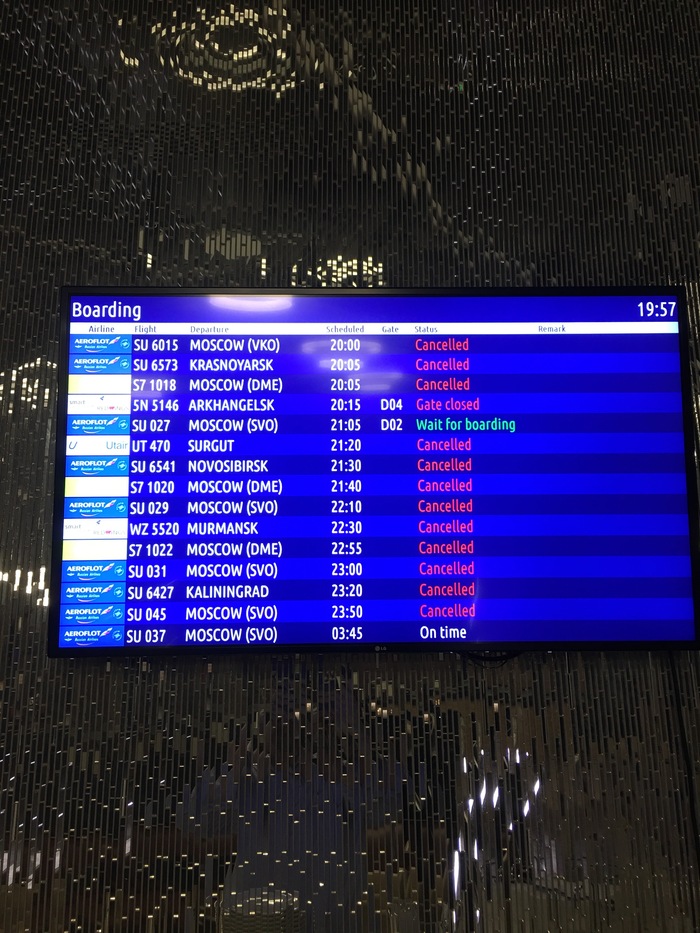 Мой рейс в 21:05, пока не отменен. Кто-то еще надеется улететь в Архангельск:)