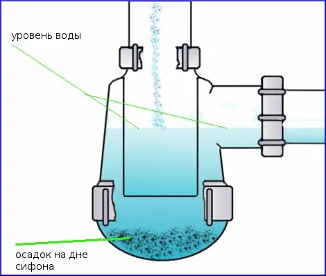 В верхней части располагается патрубок подключения к умывальнику. Обычно это небольшой отрезок трубы диаметром 32 мм и длиной 120-150 мм с двумя гайками на концах. Нижняя гайка с уплотнительной прокладкой. Верхняя гайка присоединяет патрубок к умывальнику, а нижняя – к резервуару сифона.