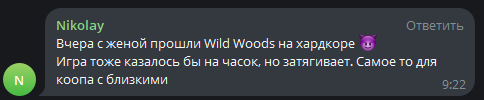 Что говорит Nikolay: Вчера с женой прошли Wild Woods на хардкоре 😈 Игра тоже казалось бы на часок, но затягивает. Самое то для коопа с близкими.