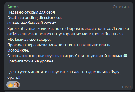 Антон пишет: Недавно открыл для себя Death stranding directors cut. Очень необычный сюжет. Вроде обычная ходилка, но со сбором всякой «почты». Да еще и отбиваешься от всяких потусторонних монстров и бьешься с МУЛами за свой скарб. Прокачав персонажа, можно гонять на машине или на мотоцикле. Очень атмосферная музыка в игре. Стоит отдельной похвалы!!! Графика тоже на уровне! Где-то уже читал, что выпустят 2-ю часть. Однозначно буду брать!!