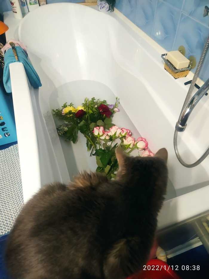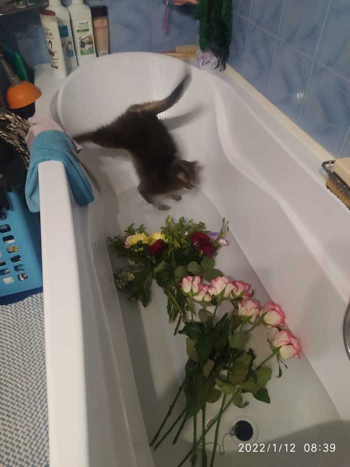 Котик изучает ванну с пеной