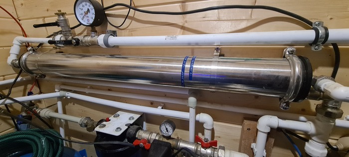 Также, на выходе концентрата сделан байпасс, чтобы, не трогая настройку выхода концентрата, подать максимальный поток воды через корпус мембраны для её очистки. Пока что - вручную. Приходится бегать и хотя-бы раз в 2-3 дня промывать. Планирую поставить автоматику на это дело (уже 2 года планирую, ага).После счетчика, концентрат уходит в канаву, а пермеат - в бак на 500 литров, который установлен в будущей сауне (тут же бродит пивко, ему тут комфортно).
