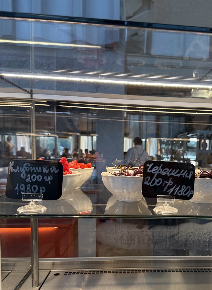 Я смотрел, что заказывают гости, и примерно прикидывал, что поход на двоих сюда, чтобы полноценно поесть, даже без алкоголя и с обычными напитками, обойдется в минимум 10 000 рублей. А если заказывать алкоголь или приходить сюда после тренировки, то мне сложно представить, сколько здесь можно оставить. Вот еще одно блюдо в качестве примера: паста от 2000 р, порция 250 г. Если добавить гриль, даже самый скромный, то добавьте еще 3000 р. 200 г клубники стоят 2000 р, то есть 10 000 р за килограмм. Так что, наверное, 10 000 р на двоих даже не хватит; думаю, нужно ориентироваться на 15 000 р.