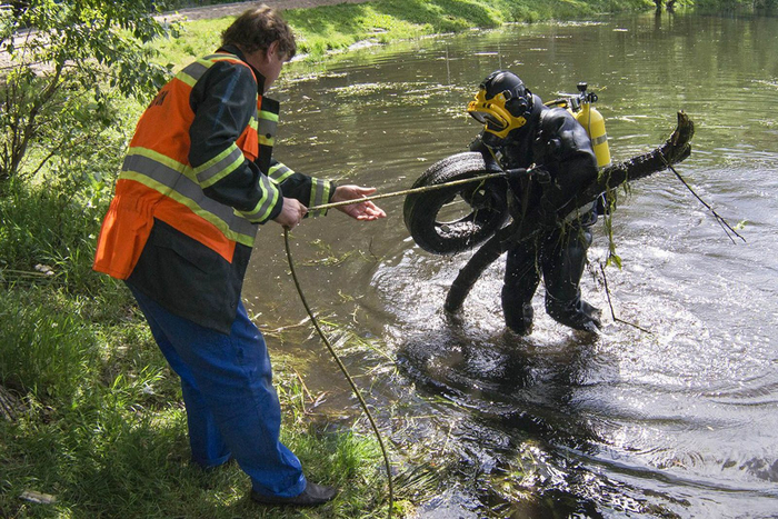 Вручную, три водолаза подняли около 4-х тонн. Бутылки, оплетки кабелей, аккумуляторы, и даже унитаз с раковиной, кондиционер, и других материалов жизнедеятельности человека