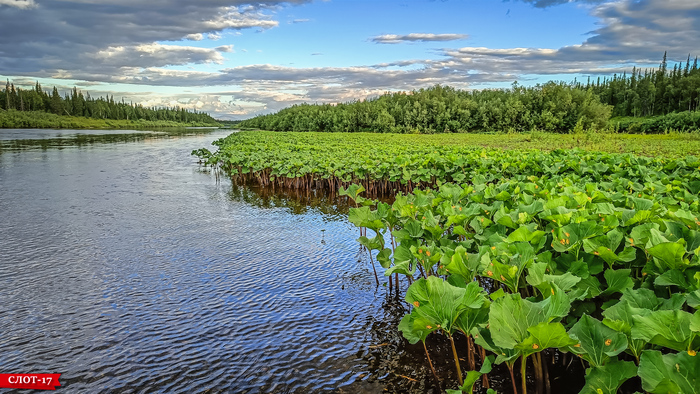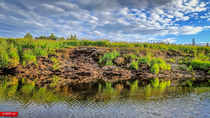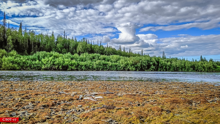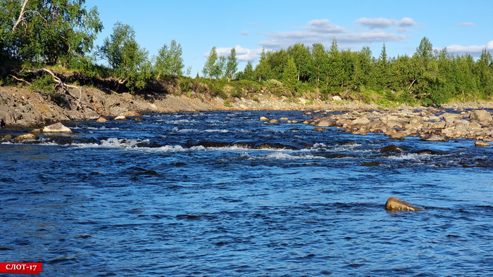 Вода прозрачная, а дно каменное. Ширина реки небольшая, а течение значительно сильнее, чем в Юнъяхе.