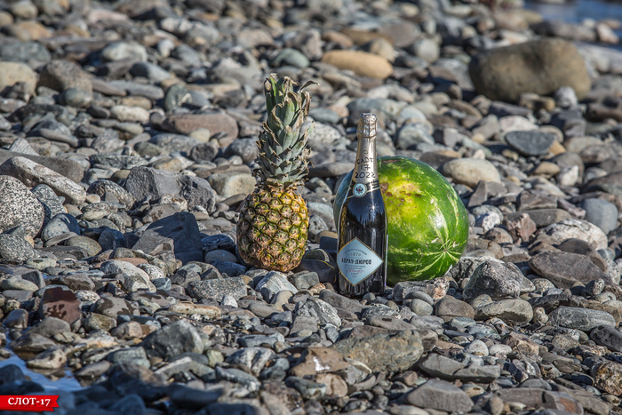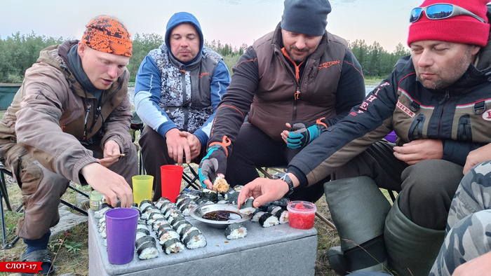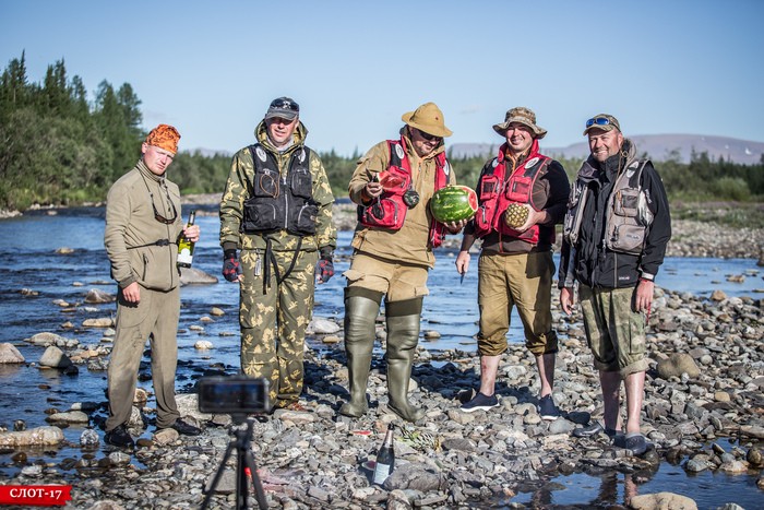 Изрядно промокнув, мы собираемся всей командой на островке и решаем дальнейший план действий. Коллективно приходим к выводу, что дальше мы пройти не сможем. Сил потрачено очень много, руки и спины гудят от нагрузок. Отмечаем наше достижение часовым отдыхом на крайней точке, бокалом шампанского, арбузом и ананасом. "Слава СЛОТ17!"