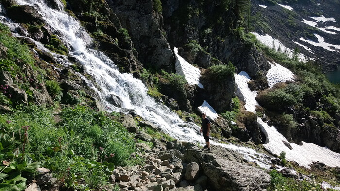 Республика Алтай, Усть-Коксинский район, Нижнее(Первое озеро у Красной горы. В озеро падает небольшой водопад с отменно чистой ледяной водой.