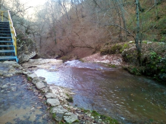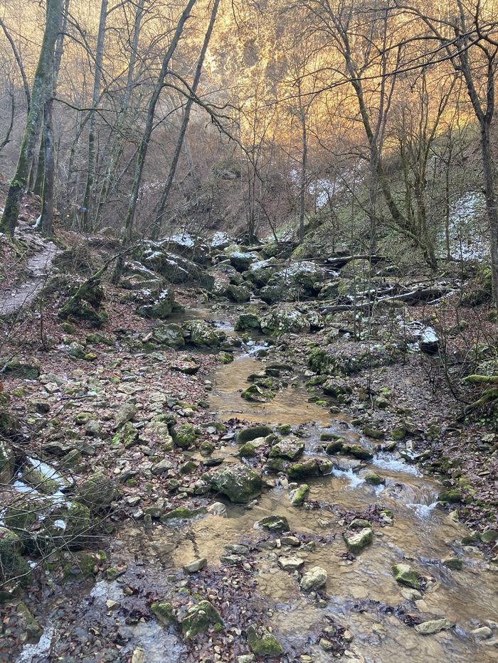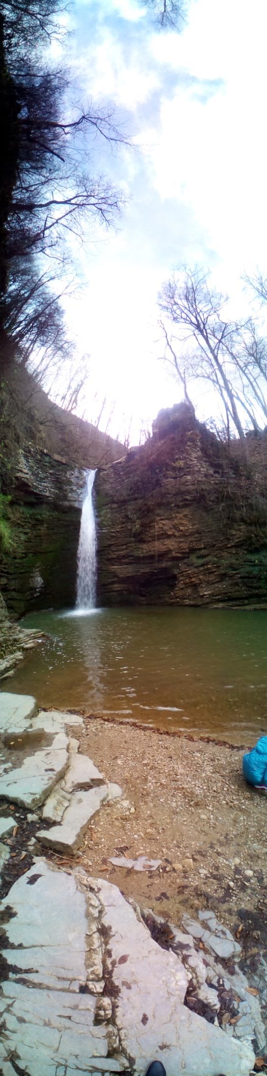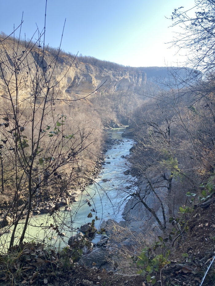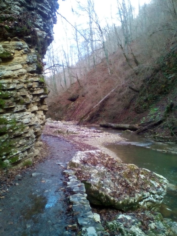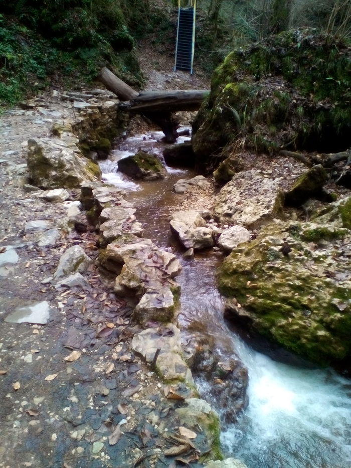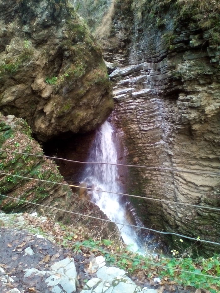 А можно проехать чуть дальше, оставить авто и пойти пешком, минуя кпп с обилечиванием, в этом случае вы потеряете около часа, немного сил и пройдете под скалой по довольно крутой обрывистой тропке. Мы выбрали второй вариант. И, наверное, если я туда вернусь, то выберу также бесплатный путь, чтоб очень рано с утра уже быть у водопада "Сердце Руфабго" и уже потом пойти еще дальше, смотреть остальные водопады.