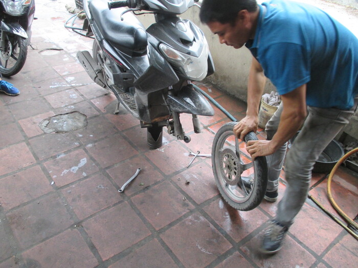 Отправились дальше на остров Cai Rong, где я увидел в конце одной дороги храм на картах. Правда ехали мы не долго, так как Лёня пробил переднее колесо на байке, пришлось сделать остановку и поменять камеру за 100.000 VND.