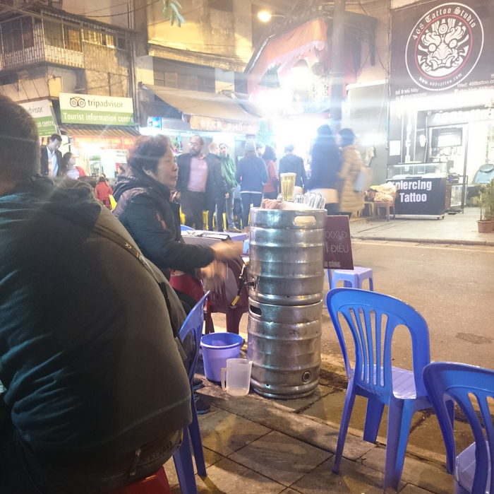 Зато после ужина добили все это пивом. На улицах Ханоя есть такие места, где стоят пластиковые столики, а женщина наливает прямо из бочки пиво по 5.000 VND за стакан. Пиво конечно так себе, но ничего, сойдет)