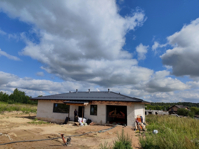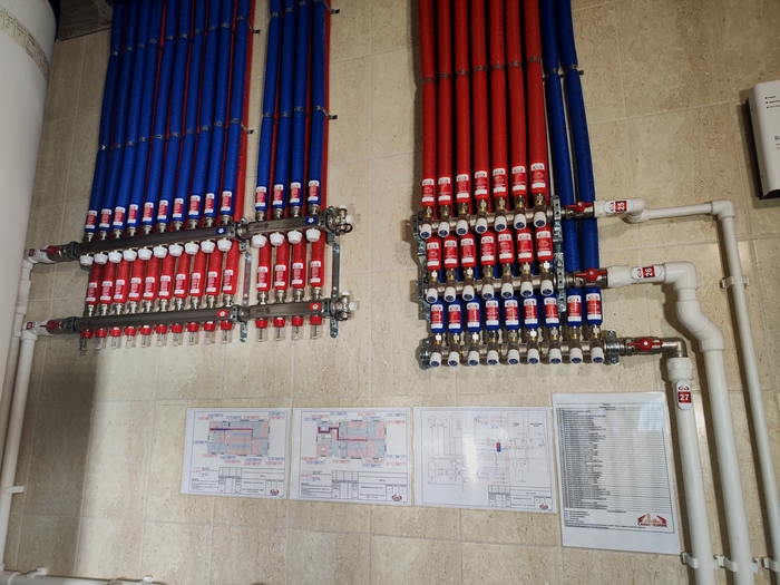 У Юры и Жени два по сути одинаковых объекта подряд. Этот одноэтажный дом с системой отопления только из теплых полов и водоснабжением с рециркуляцией ГВС они уже смонтировали(котельную выложу позже). И следующий абсолютно такой же. Только здесь вид топлива газ, а там электричество. И здесь коттедж из газобетона, а там из бруса.
