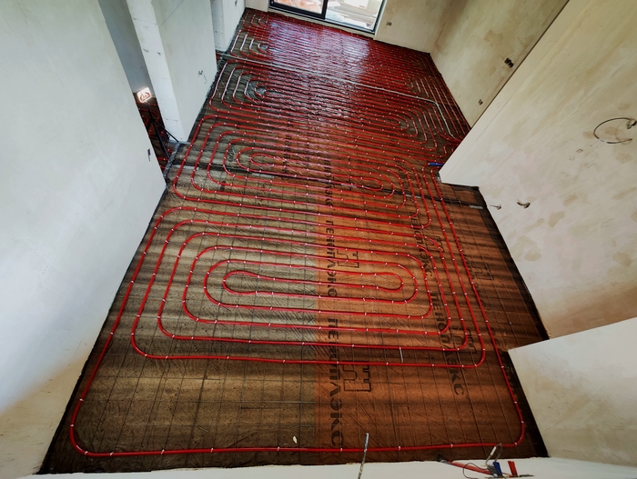 Тут мы опять же имеем теплые полы, как основную и единственную систему отопления во всех помещениях на обоих этажах дома. Заказчик сам изначально поставил такую задачу, утвердив абсолютно во всех помещениях плитку в виде напольного покрытия. Это он и получил в итоге.