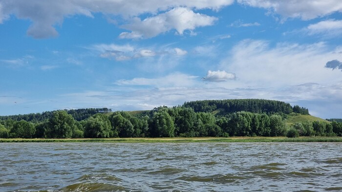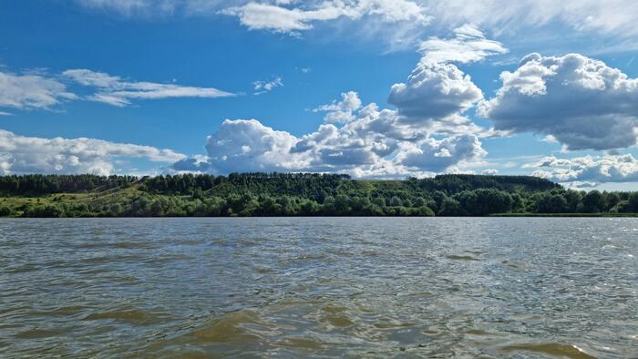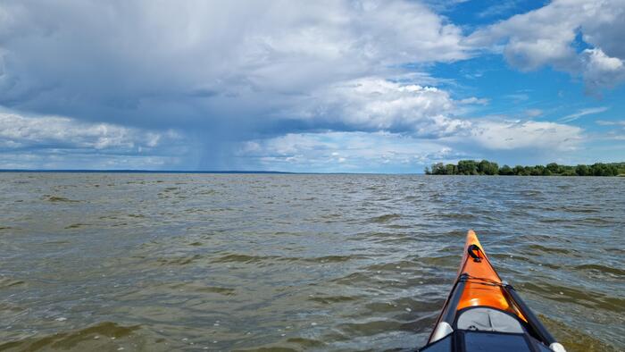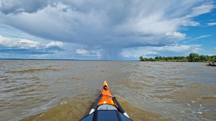 Вопреки всякой логике — ведь ещё со вчерашнего дня наблюдал за ливнями над Чебоксарами — я совершил классическую ошибку новичка: оставил непромокаемую куртку за спинкой сиденья. Чтобы достать её, нужно было снять юбку, что под таким потоком было всё равно что вылить в каяк ведро воды. Холодные капли барабанили по плечам, и я начал стремительно замерзать.